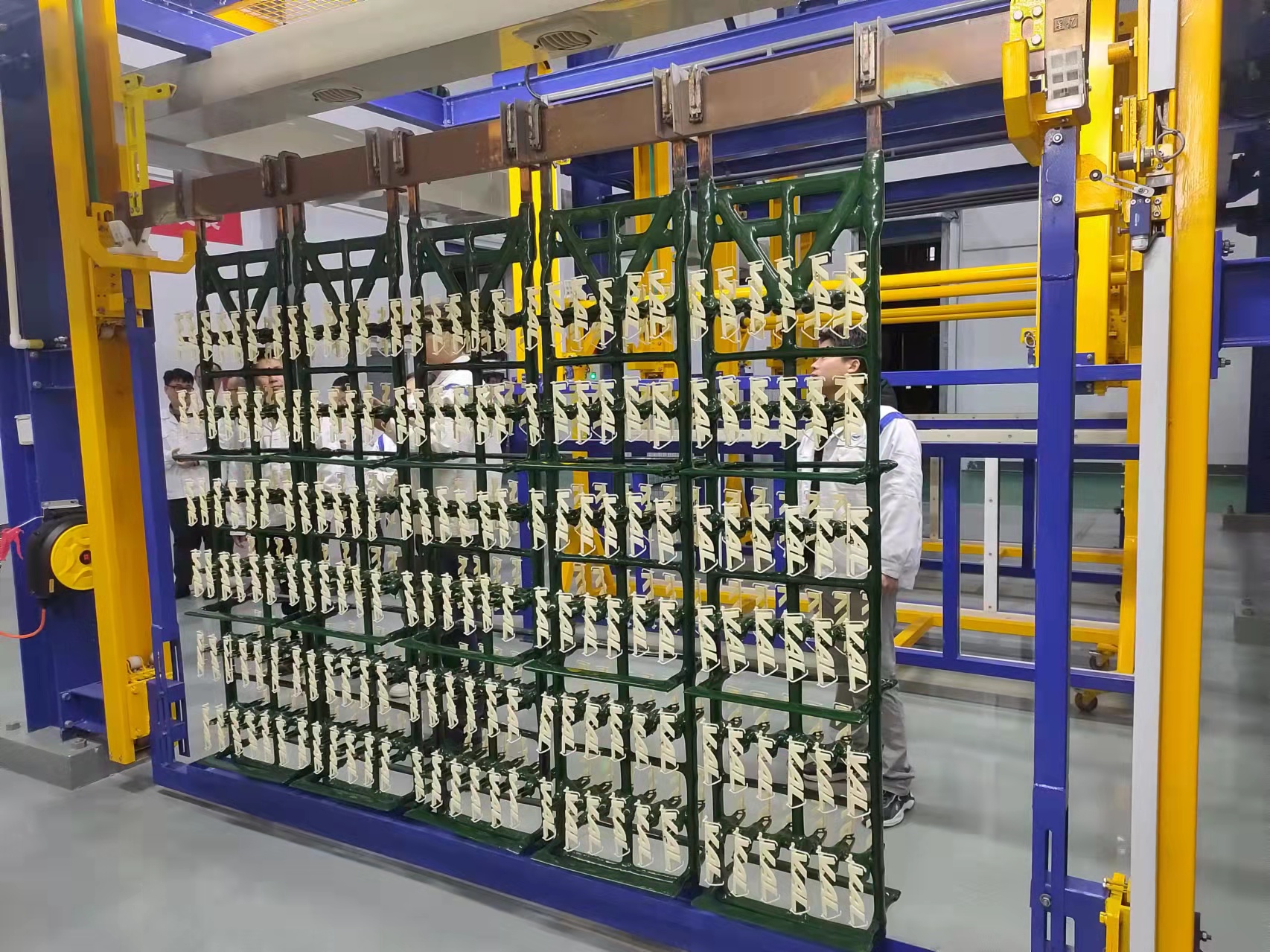 在电镀车间,技术人员及工人们正在进行设备的最后调试。随着工业工厂厂长许露燕与车间主任茹维锋共同启动开线按钮,产品经过超声除油、化学沉镍、镀铜、镀镍、镀铬等18道主要工艺流程,完成120多个槽位的自动化流水线加工,在不到3.5个小时的时间里顺利产出。